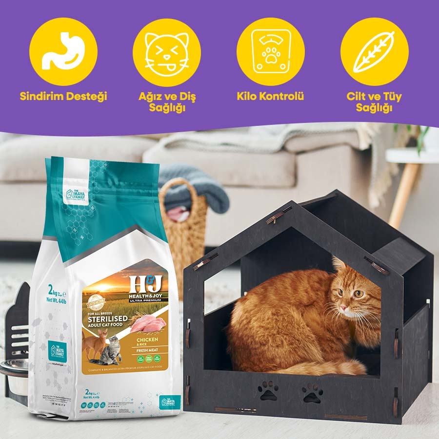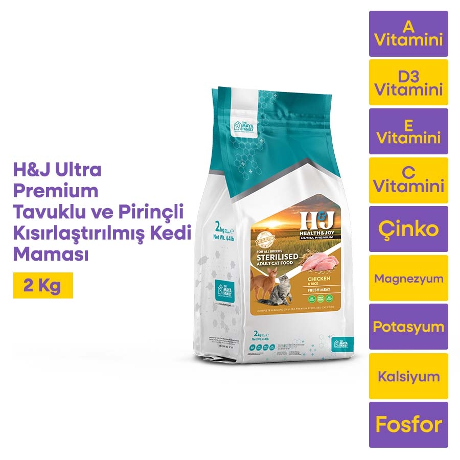 Health & Joy (H&J) Ultra Premium Tavuklu & Pirinçli Kısırlaştırılmış Yetişkin Kedi Maması, kısırlaştırılmış yetişkin kedilerin ihtiyaç duyduğu tüm besinleri dengeli bir şekilde sunar ve aşağıdaki özellikleriyle öne çıkar: